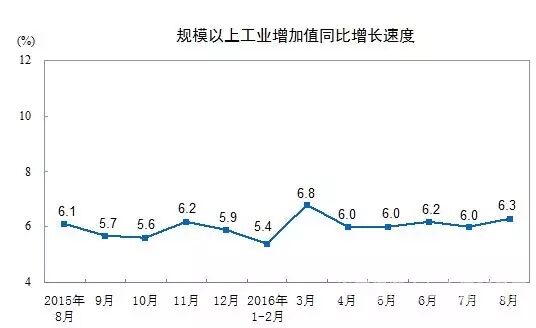 2016年8月份,规模以上工业增加值同比实际增长6.3%(以下增加值增速均为扣除价格因素的实际增长率),较7月份加快0.3个百分点。从环比看,8月份,规模以上工业增加值增长0.53%,比上月加快0.01个百分点。1-8月份,规模以上工业增加值同比增长6.0%。