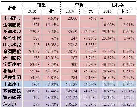 2016年,全国商品混凝土产量17.9亿立方米,同比增长7.4%,混凝土与水泥制品行业实现利润总额658亿元,同比增长4.1%。从上市企业来看,14家由混凝土业务经营的企业总销量同比增长6.25%,但由于大部分企业混凝土销售价格出现回落,导致13家企业(除金隅股份)整体销售收入同比只有1.25%的提升,而11家企业(除中国建材、金隅股份、山水水泥)整体毛利润同比下滑3.3%。