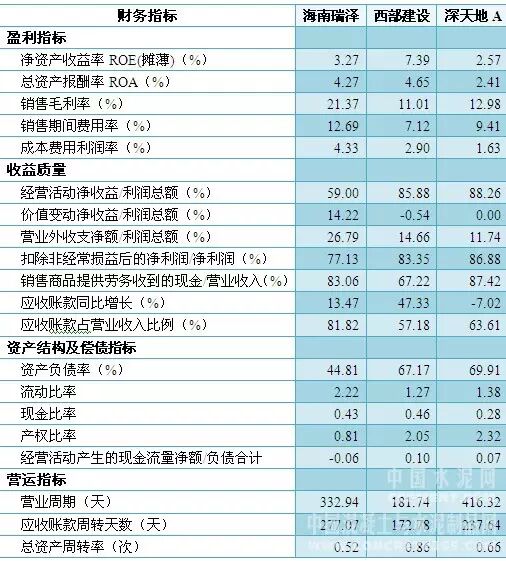 从上图可以看出,上海建工及大部分水泥企业的商混业务营业收入占比较小,水泥企业中只有金圆股份的商混业务收入规模占比较大。海南瑞泽、深天地、西部建设仍是商混为主的上市公司,公司整体的财务指标基本能够完全或部分体现混凝土业务的财务情况,因此,本文只对这三家企业进行财务指标比较。