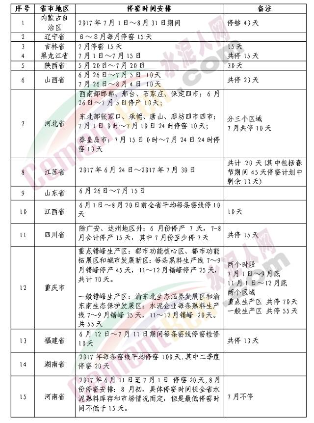 本月初水泥人网曾发布水泥企业夏季错峰生产7月份停窑时间表。涉及十五个省市。