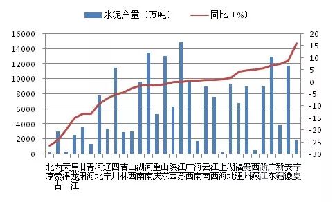 图6:2017年1-10月各省水泥产量及增速