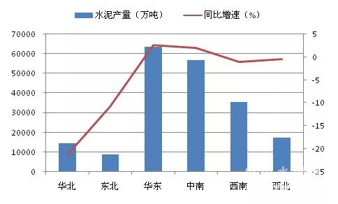 图5:2017年1-10月六大区域水泥产量及增速