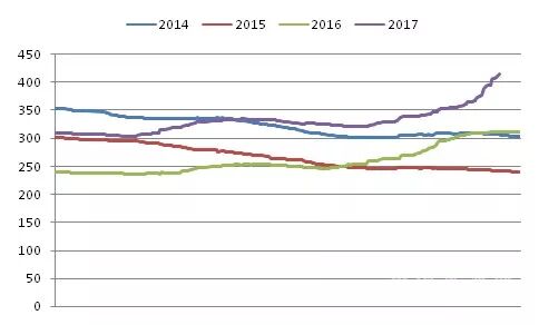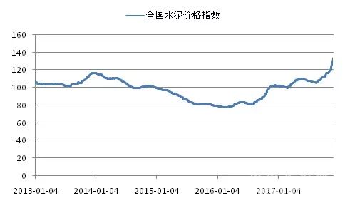 在经过2014和2015年两年的持续下跌后,水泥价格终于在2016年逐步回暖,而今年以来水泥价格持续波动上扬。8月中旬以前,全国水泥价格基本维持淡旺季走势,1-2月冬季淡季回落,3-6月回升,7-8月淡季再次回落,8月下旬开始,全国水泥价格开始扶摇直上,不仅在金九银十传统旺季持续回升,11月多个地区更是持续大幅上调水泥价格。截止11月30日,全国水泥价格指数达到134.98点,同比上涨32.18%。全国P.O42.5散装水泥平均价格突破400元/吨的高位,远高于前三年的最高水平。