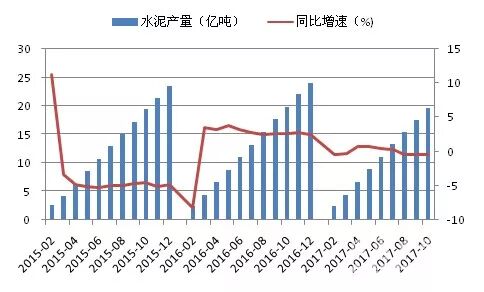由于投资增速的持续回落,导致水泥需求小幅萎缩。上半年投资增速仍处于相对高位,水泥产量一度小幅同比正增长。而随着投资增速的逐步放缓,再加上房地产投资实际增速远低于去年同期水平,均对水泥需求增长造成一定的压力。同时,供给端控制成效显著,水泥产量逐步回落至同比小幅负增长。截止今年10月份,全国共生产水泥19.63亿吨,同比小幅下滑0.5个百分点。在经过2015年全年的下跌和2016年的回暖后,预计今年的水泥产量将出现同比小幅下滑,全年水泥产量在23.8亿吨左右。