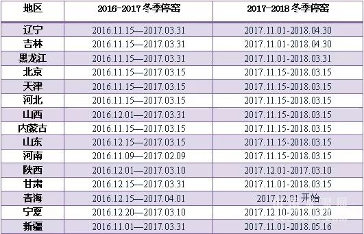 表1:2017年北方十五省冬季错峰停窑时间进一步延长
