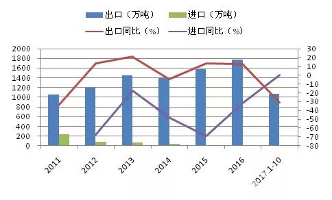 图7:2011-2017年1-10月全国水泥及熟料进口规模及增速
