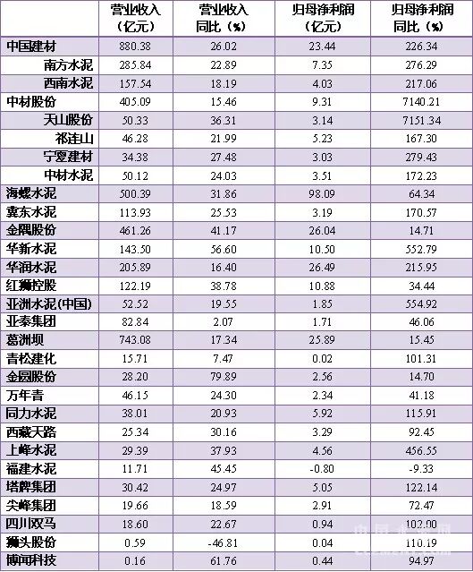 同时,水泥企业亏损面进一步缩窄,在已发布三季度财报的企业中,前三季度只有福建水泥仍然没能盈利,而冀东水泥、亚洲水泥和青松建化均实现了同比扭亏。从部分主要水泥企业前三季度业绩情况可以看出,大部分水泥企业均实现了营收和净利润的不同程度增长。中国建材和海螺仍然以较大优势保持着行业领先的地位,海螺更是以98.09亿的归母净利润水平持续保持行业第一,而且远远高于第二名的水平,相比去年同比增长了64.34%。