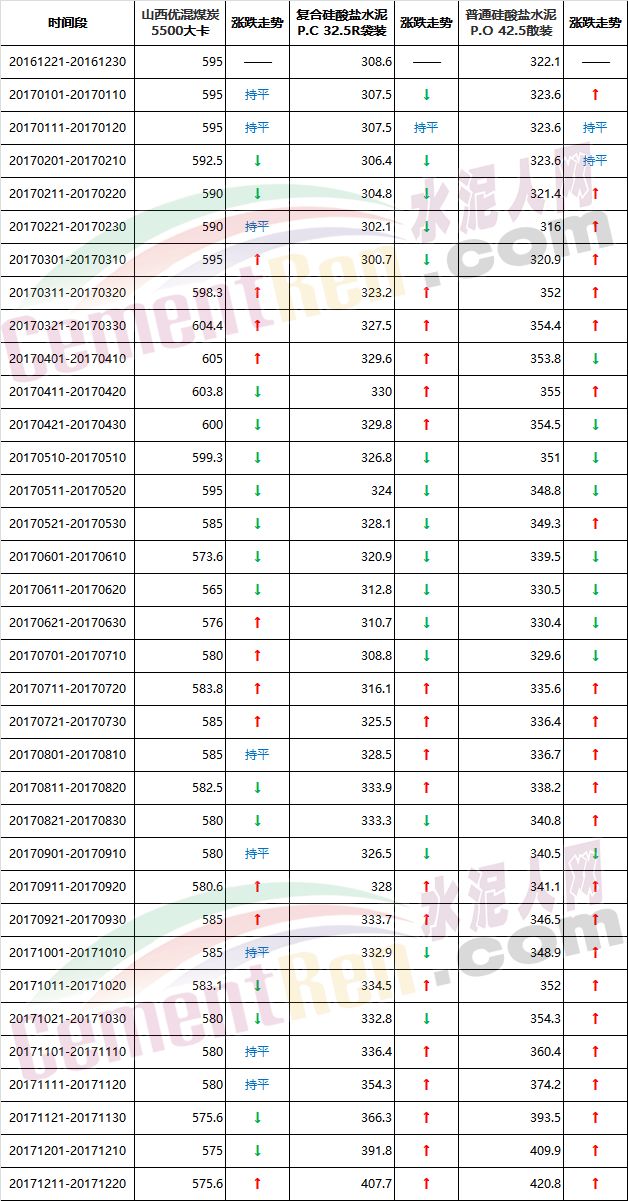 水泥人网同时整理了国家统计局发布的2017年全国从1月份到12月份水泥与煤炭每个月的均价情况如下: