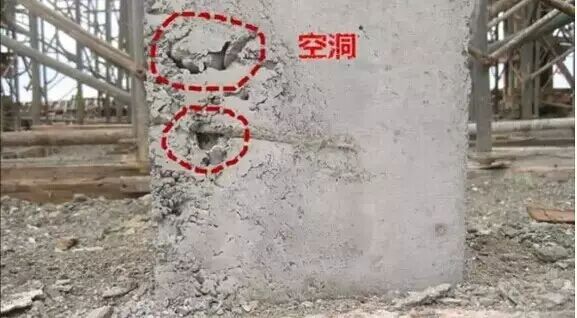 由于混凝土灌注时有一些部位堵塞不通,构件中就会产生空洞,空洞不同与蜂窝,蜂窝的特征是存在于未捣实的混凝土或缺水泥浆;而空洞却是局部或全部没有混凝土。空洞的尺度通常较大,以至于钢筋全部裸露,造成构件内贯通的断缺以至于结构发生整体性破坏。