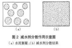 高效减水剂的大规模使用是现代混凝土的一个重要特征,它减小了混凝土强度对水泥强度的依赖性,使拌合物的流变性变得更加突出。在水泥用量一定时,以较少的水就可以达到工程要求的坍落度,这意味着降低了水灰比,从而提高了强度和抗渗性。因而,高效减水剂在混凝土中得以广泛的应用。在水泥浆体中,相邻水泥颗粒上带有相反电荷,由于静电引力的作用,引起水泥颗粒发生絮凝。浆体中大量的水被絮凝体所包裹(图 2a),剩余的水决定了水泥浆或混凝土的流动性。减水剂是阴离子型的有机化合物,其分子吸附在固水界面上,使水泥颗粒表面都带有相同的电荷,此时颗粒相互排斥而分,分散于浆体中(图 2b),从而使更多的水可以用来改善水泥浆或混凝土的流动性。虽然减水剂能够明显改善混凝土的坍落度,但它却不能增大混凝土的粘聚性。聚羧酸减水剂能够明显削弱水泥颗粒与水之间的作用,使自由水的释放非常明显,这在一定程度上增大了混凝土泌水的可能性。当发生下列两种情况时,混凝土易发生滞后泌水。