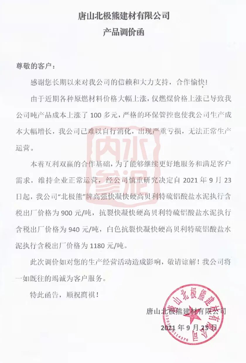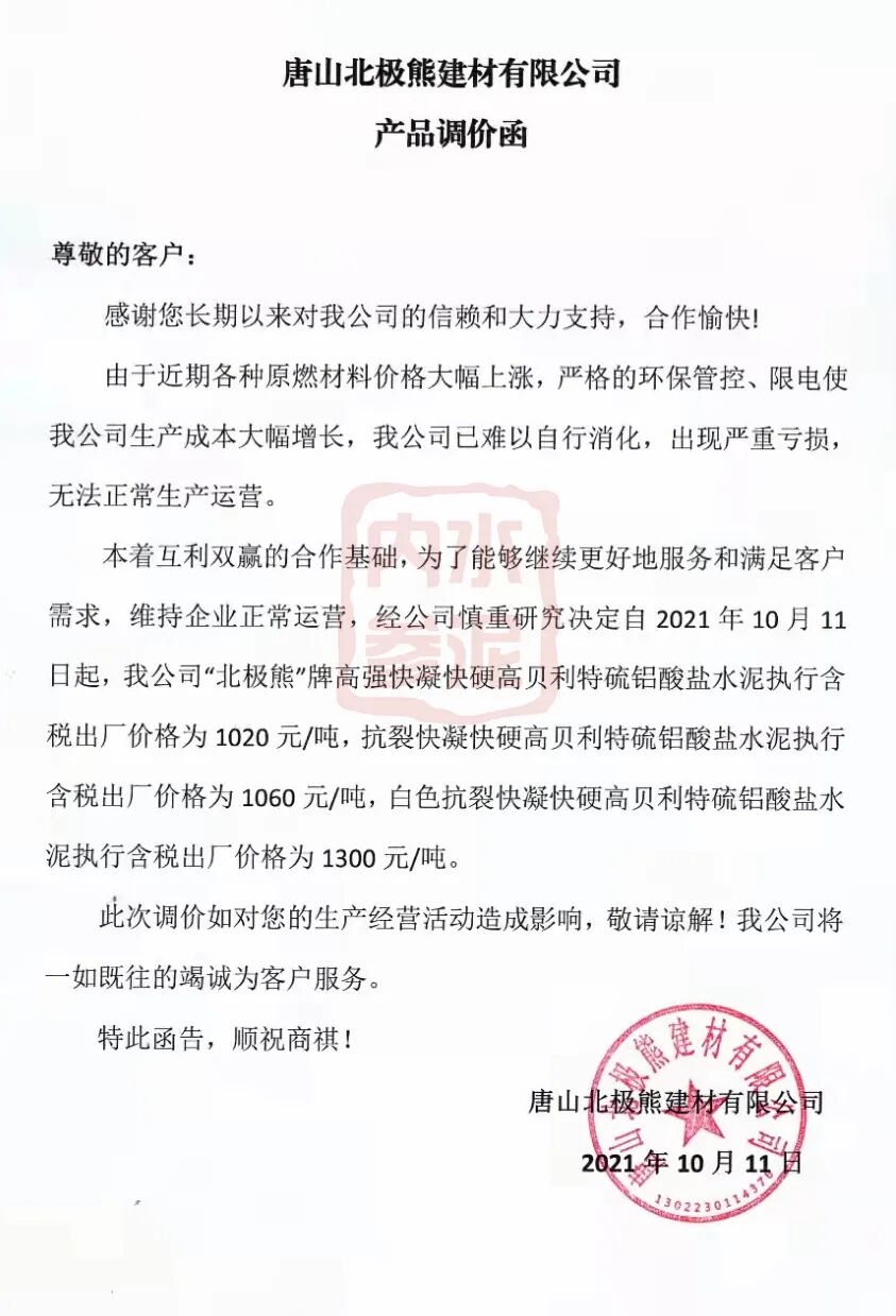 唐山北极熊建材有限公司发布产品调价函,称由于近期各种原燃材料价格大幅上涨,严格的环保管控、限电使公司生产成本大幅增长,公司已难以自行消化,出现严重亏损,无法正常生产运营。