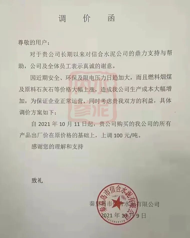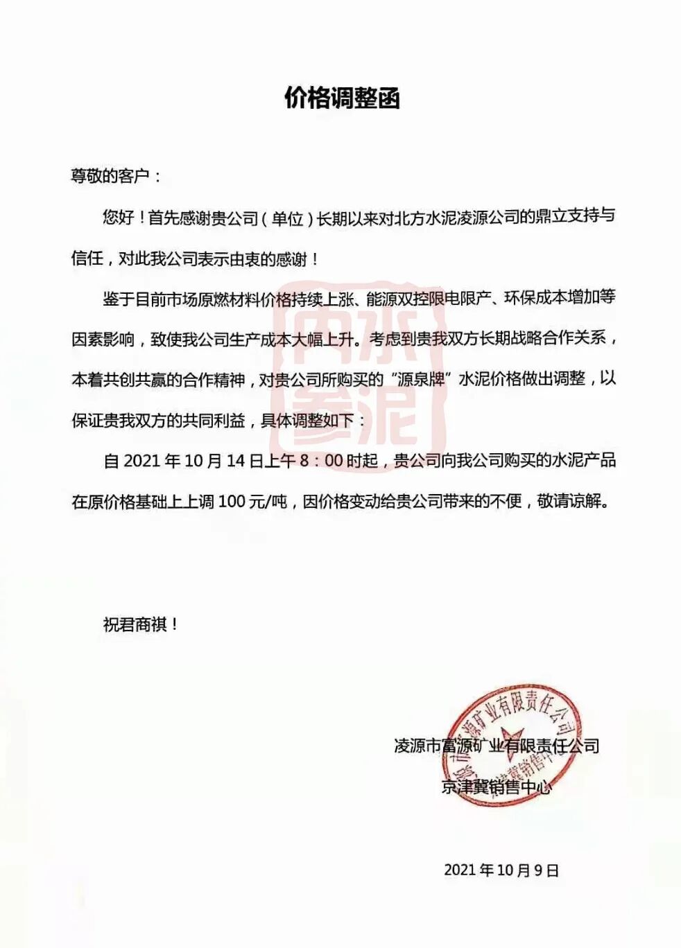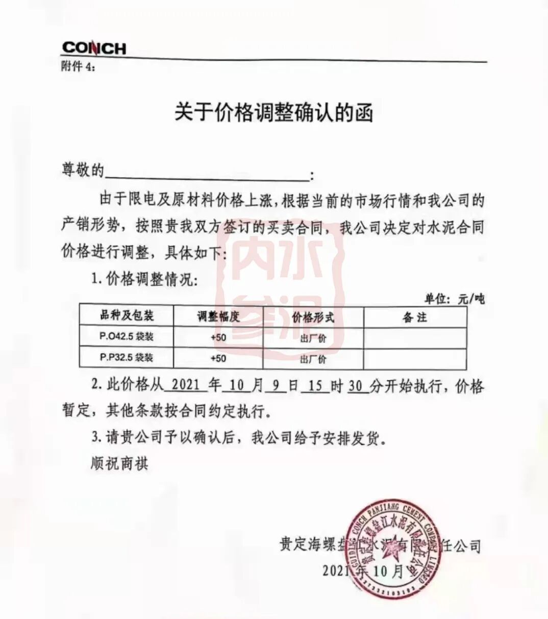 考虑到双方长期战略合作关系,本着共创共赢的合作精神,对水泥价格做出调整,自2021年10月14日上午8:00时起,水泥产品在原价格基础上上调100元/吨。