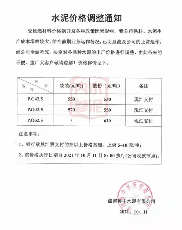 自2021年10月12日零时起,对我公司各品种水泥在现行价格基础上上调50元/吨。