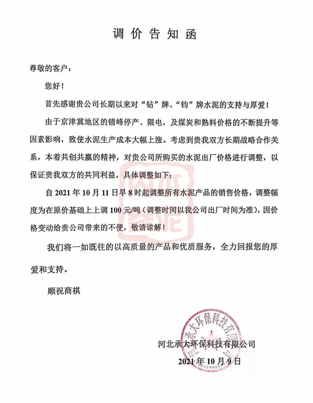 河北承大环保科技有限公司发布调价告知函,称由于京津冀地区的错峰停产、限电,及煤炭和熟料价格的不断提升等因素影响,致使水泥生产成本大幅上涨。