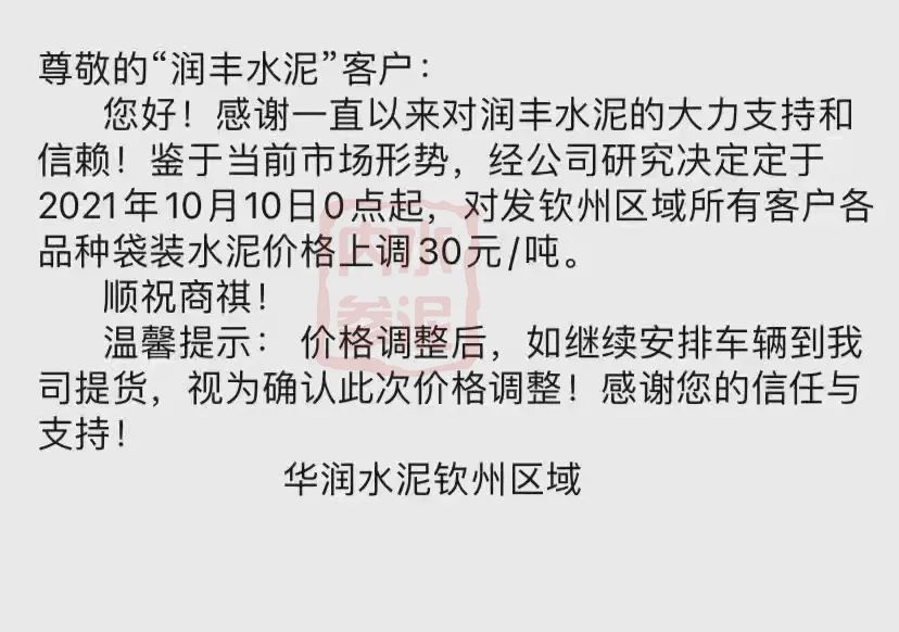 华润水泥钦州区域发布通知,鉴于当前市场形势,经公司研究决定定于2021年10月10日0点起,对发钦州区域所有客户各品种袋装水泥价格上调30元/吨。