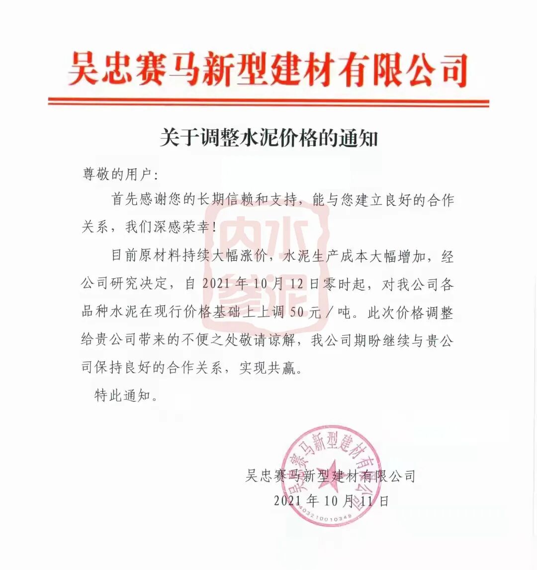 吴忠赛马新型建材有限公司发布关于调整水泥价格的通知,目前原材料持续大幅涨价,水泥生产成本大幅增加,经公司研究决定: