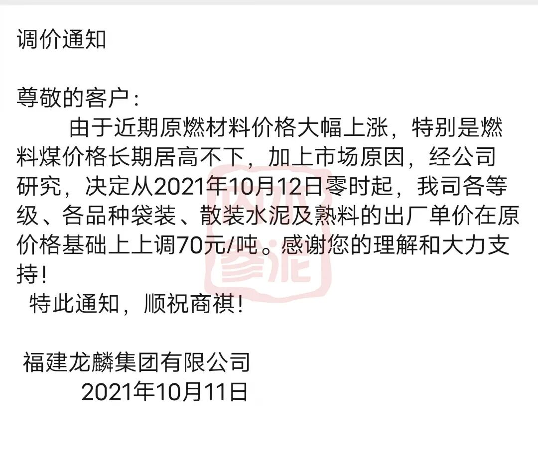 福建龙麟集团有限公司发布调价通知,由于近期原燃材料价格大幅上涨,特别是燃料煤价格长期居高不下,加上市场原因,经公司研究: