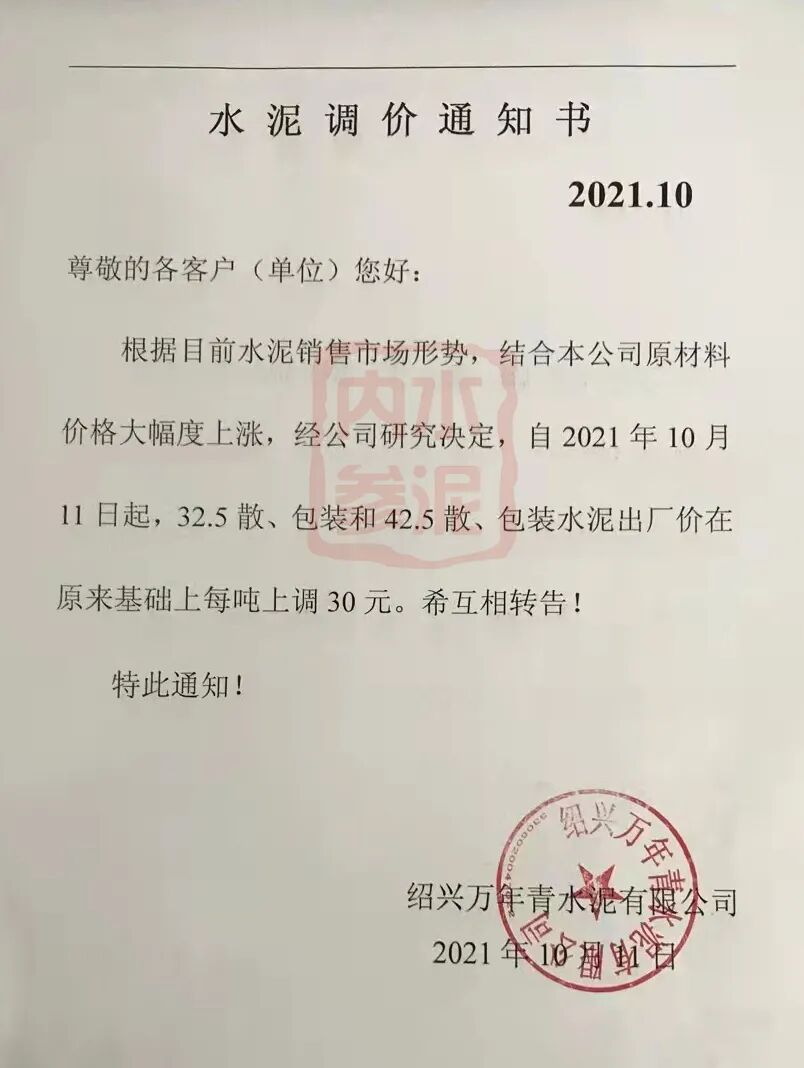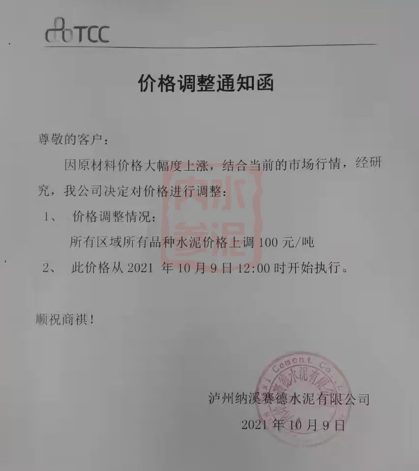 自2021年10月11日早8时起调整所有水泥产品的销售价格,调整幅度为在原价基础上上调100元/吨。