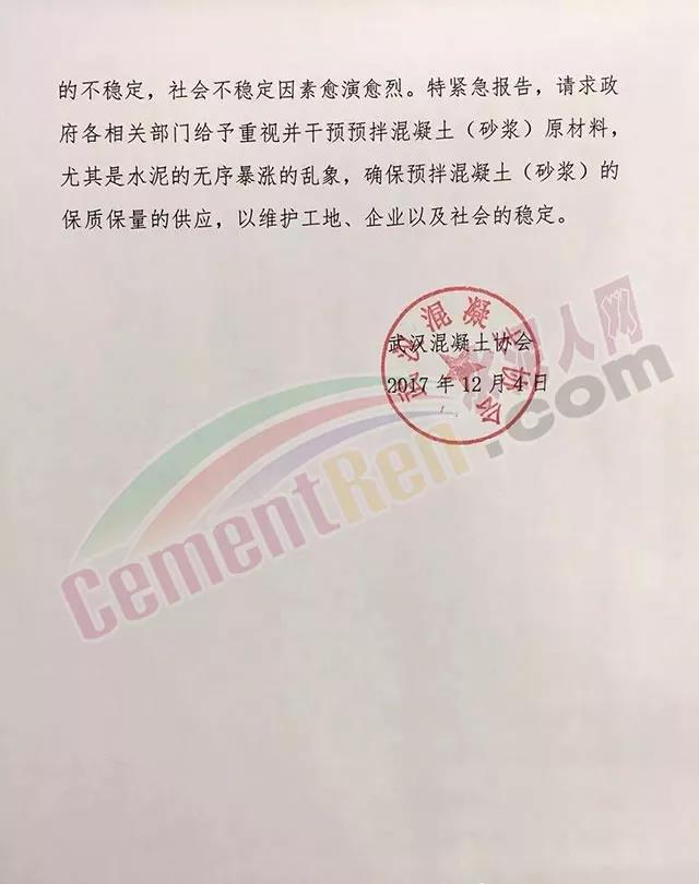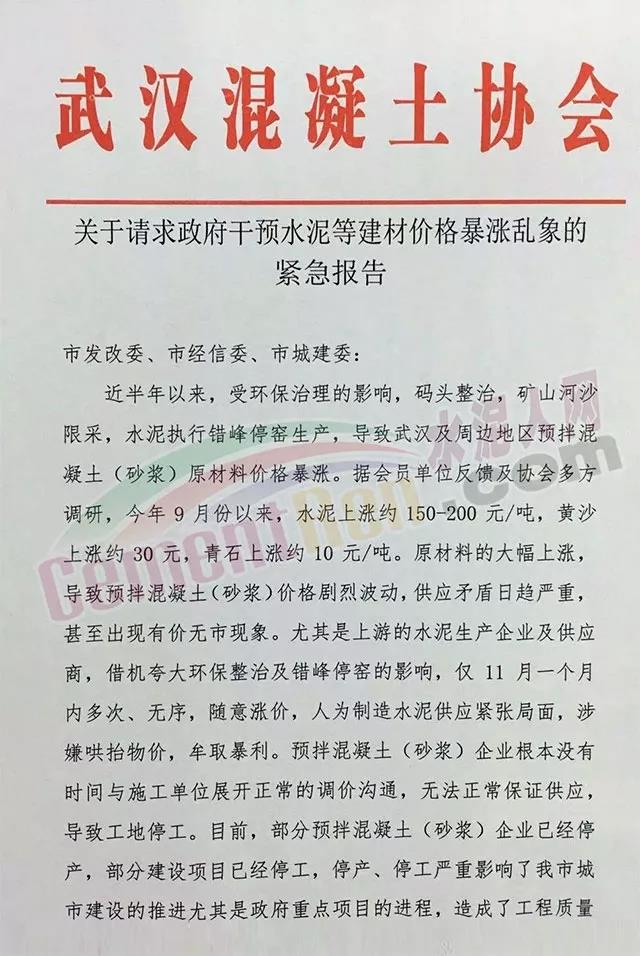 日前武汉混凝土协会发《关于请求政府干预水泥等建材价格乱象的紧急报告》给武汉市发改委、市经信委、市城建委等部门。