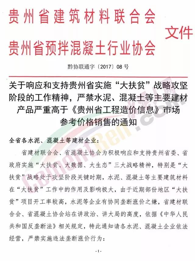 前天(5日)贵州省建筑材料联合会,贵州省预拌混凝土行业协会发布《关于响应和支持贵州实施”大扶贫“战略攻坚阶段的工作精神,严禁水泥、混凝土等主要建材产品严重高于《贵州省工程造价信息》市场参考价格销售的通知。通知称:省建材联合会、省混凝土协会为积极响应和支持贵州省委、省政府实施“大扶贫、大数据、大生态”三大战略精神,特别是“大扶贫”战略处于攻坚阶段关键时期,水泥、混凝土等主要建筑材料在“大扶贫”工作中的作用及影响极大,由于近期部分地区“大扶贫”项目开工率较高,水泥等企业有协同垄断涨价之嫌,省建材联合会、省混凝土协会站在讲政治、讲大局的高度,依据《中华人民共和国反垄断法》相关规定通知各水泥‘混凝土企业依法经营,严禁实施违法垄断涨价行为。