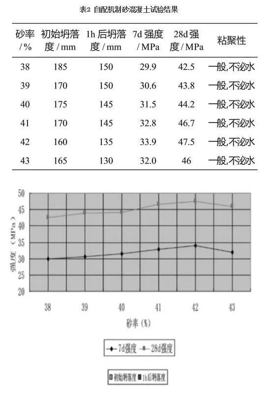 利用实际生产的机制砂配制出符合国家标准的II级砂(细度模数为2.8,级配与天然砂相同),分别以38%、39%、40%、41%、42%、43%的砂率配制混凝土,然后进行混凝土拌合物性能和抗压强度试验,试验结果见表2和图1。