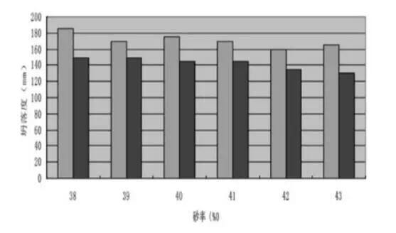 由表2、图1中可以看出,在同样的颗粒级配下,采用自配机制砂配制的混凝土,其工作性较之天然砂配制的混凝土差一些,分析应是机制砂的颗粒表面粗糙,棱角较多从而导致混凝土的工作性能差于天然砂,从泵送要求来看,还要采取其他措施来改善机制砂的流动性;从强度上看,机制砂混凝土的强度较之天然砂有所提高,分析同样是机制砂的特点,提高了其与胶凝材料的结合度从而为其混凝土强度作贡献。因而综合考虑,在设计机制砂泵送混凝土的配合比时,水灰比将有所增加,其砂率也有所提高,根据具体使用机制砂的情况,砂率选定在40%~42%比较合理。
