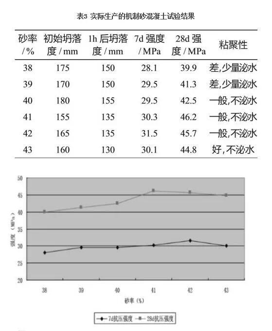 利用实际生产的机制砂,分别以38%、39%、40%、41%、42%、43%的砂率配制混凝土,然后进行混凝土拌合物性能和抗压强度试验,试验结果见表3和图2。