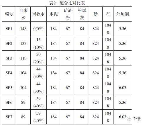 试验配合比采用搅拌站常用的C30配合比,通过实验对比分析回收水掺量不同时的影响,具体试验配比情况见表2。