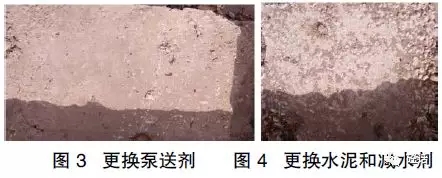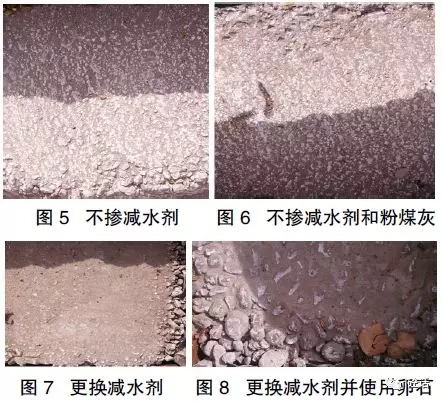 (3)博腾泵送剂换成包头屹峰泵送剂,其他原材料不变进行试拌,混凝土未养护的情况下,24小时后混凝土表面出现泛碱,浇水处理后,一半覆膜养护,一半裸露做对比,经过二次处理后覆膜养护的混凝土泛碱消失,裸露在自然条件下的混凝土泛碱现象减少(如图3)。