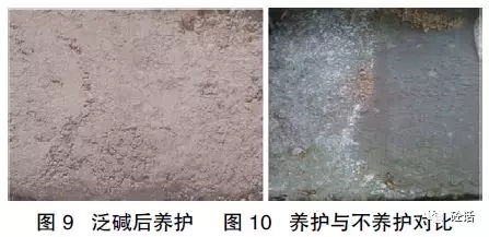 (9)用于结构中的混凝土覆膜养护3天后没有出现泛碱现象。没有覆膜养护的混凝土,出现泛碱现象后进行洒水养护3天,泛碱现象明显减少(如图9)。