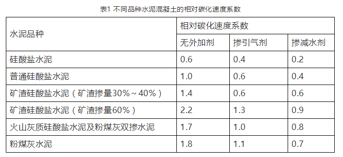 不同的水泥品种所含的包含的矿物成分不同,水泥的活性也不同,对混凝土强度和碱性的影响也有所不同。一般来说,早强型的水泥品种的抗碳化能力也较高,普通硅酸盐水泥要比早强硅酸盐水泥碳化稍快,对同一熟料的水泥来说,混合材含量越高,其活性混合材越易与水泥水化产物Ca(OH)2反应,加速其碳化速度。
