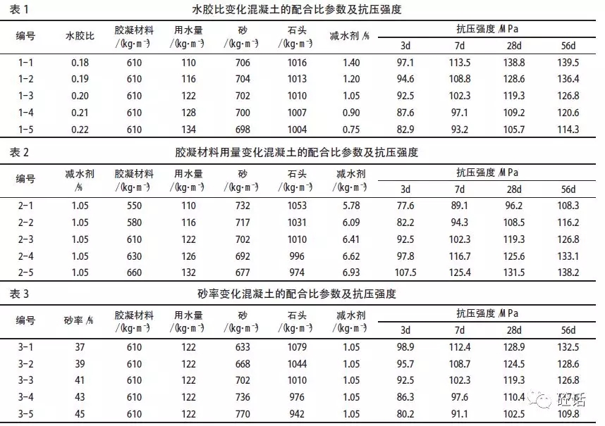不同配合比参数混凝土抗压强度试验结果分别列于表1~表3中,试验采用混凝土坍落度、坍落扩展度和混凝土T50达到时间来评价混凝土的工作性及可泵送性能。