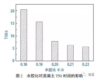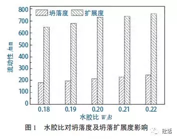 (1)水胶比变化影响试验。混凝土配合比中砂率为41%,固定胶凝材料总质量为610kg/m3,胶凝材料各组分质量比为,水泥:矿粉:粉煤灰:玻化微珠=65%:15%:10%:5%:5%,水胶比变化为0.18、0.19、0.20、0.21和0.22,进行对应试验研究,混凝土配合比见表1。