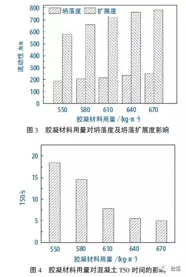 胶凝材料用量对混凝土流动性及强度性能的影响试验中混凝土坍落度、扩展度与T50达到时间结果分别如图3和图4所示。