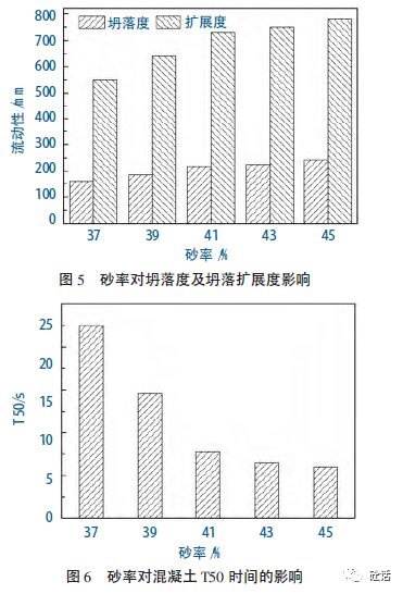 砂率对混凝土流动性及强度性能的影响试验的混凝土坍落度、扩展度与T50达到时间结果分别如图5和图6所示。